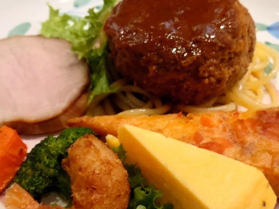 特製ハンバーグ、エビフライ、サーモンのキッシュなどの盛り合わせ。